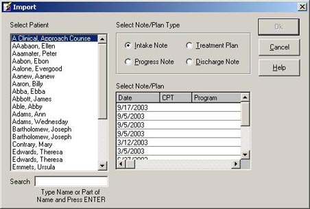 | 2. | Next, select the Note/Plan Type to import (e.g. Intake, Progress, Treatment Plan, or Discharge Note). You will then see a list of dates for possible notes or plans to import. |